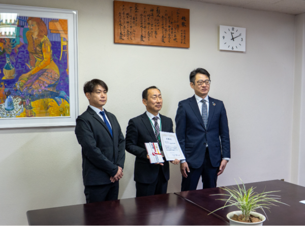 米原孝志様(受贈者代表:富山県立しらとり支援学校校長)、吉田勝則様(寄贈者代表:株式会社北陸銀行新庄支店長)、木村貴之(私募債発行企業:株式会社エイキ代表取締役)