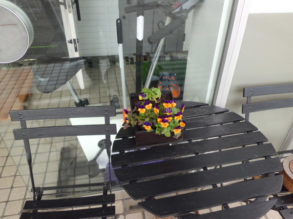 (↑ ビオラ。朝日が当たる憩いの椅子です。)