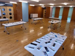 広いテーブルを5台お借りし、さっそく「再生アート」と「スクラップアート」を並べました。