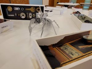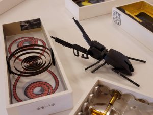最初の二つ、でんでん虫とヤドカリは身近な部品で作られていたせいか、生徒さんは目をクリクリされていました。
